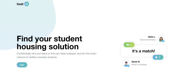 hostU არის პლატფორმა, რომელიც ხელს უწყობს საშუალოვადიანი საცხოვრებლის გაქირავებას უნივერსიტეტის საზოგადოებაში, აკავშირებს სტუდენტებსა და პროფესორებს, რომლებსაც საცხოვრებელი ესაჭიროებათ მათთან, ვინც ეძებს ქვეიჯარას. . შესატყვისი ალგორითმი ამოწმებს უნივერსიტეტის კუთვნილებას და მომხმარებლებს უგზავნის პირდაპირ დამთხვევებს პრეფერენციებისა და საჭიროებების მიხედვით. დაკავშირების შემდეგ, სტუმრებს და მასპინძლებს შეუძლიათ კომუნიკაცია და შეთანხმება პლატფორმის საშუალებით.